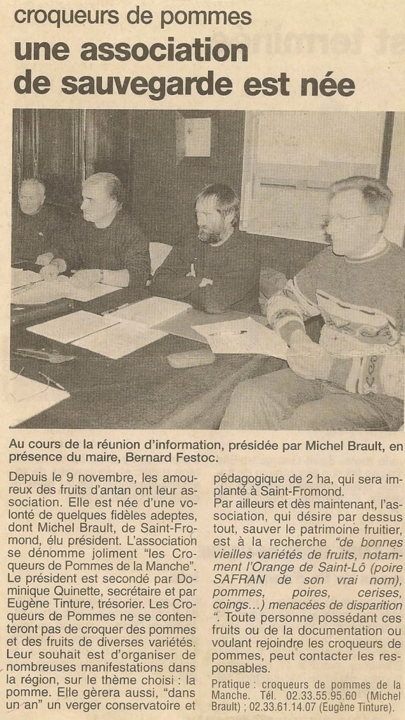 Alors qu’instituteur devenu remplaçant, je découvre par hasard une trentaine de livrets intitulés » croqueurs de pommes » …et je tombe sous le charme, moi qui avais planté une vingtaine d’arbres fruitiers ( pommiers, poiriers, cerisiers et pruniers ) alors que je n’y connaissais rien à l’arboriculture fruitière. Le soir même, j’adhère à cette association et reçois une semaine plus tard un courrier de Mr Tinture, président-fondateur des » croqueurs de pommes de Normandie » souhaitant que je le rejoigne au sein de sa section normande…Ce que je fais avec plaisir…Et, c’est à ce moment-là que je vais côtoyer nos deux grands pomologues manchois: Eugène Tinture et Gilbert Martin. Afin qu’ils ne tombent pas dans l’oubli, enfin momentanément, je leur consacrerai une partie du blog que je rêve, un jour, de créer.